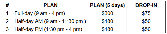 We offer 10 weeks of full training programs (5 days per week and two sessions each day). Students have an option to attend the whole 10 weeks or selected weeks that fit their schedules. Students also have the option to attend half day (AM or PM) or full day.